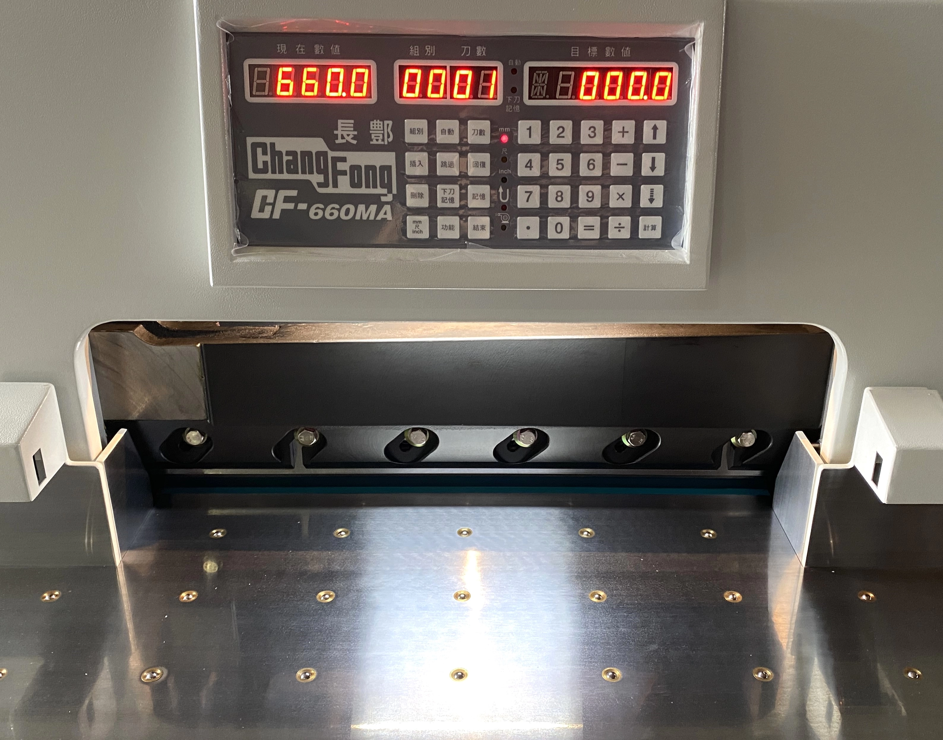 裁切高度:110mm裁切寬度:660mm裁切最小長度:20mm裁切最大長度:660mm檯面高度:890mm機械寬度:1380mm機械長度:1435mm機械高度:1410mm所需用電:三相220V所需電力:5HP機械重量:1000kg